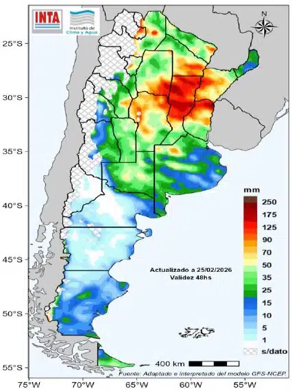 Las lluvias se concentran en el centro y norte del país durante las próximas dos semanas, mientras que el centro y sur de la región Pampeana seguirían con aportes escasos.