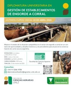 (NAP) La Facultad de Ciencias Agrarias de la Universidad Nacional de Lomas de Zamora (Agrarias-UNLZ) abrió la inscripción a la Diplomatura Universitaria en Gestión de Establecimientos de Engorde a Corral, una propuesta académica estratégica que se desarrolla en articulación con la Cámara Argentina de Feedlot (CAF).