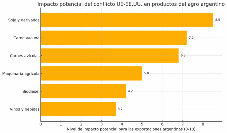 Por ejemplo, si la Unión Europea restringe la compra de soja estadounidense con aranceles, es probable que aumente la demanda desde países del Mercosur, especialmente si avanza el acuerdo comercial entre ambos bloques. Lo mismo podría ocurrir con cortes de carne bovina y productos avícolas, donde Argentina mantiene una posición consolidada como proveedor confiable.