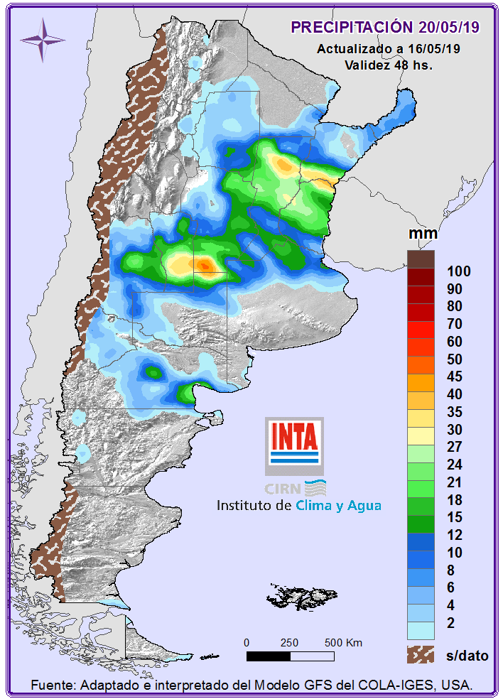 Ya para el sábado 18 de mayo, “un frente frío se desplazaría sobre el centro del país hacía el noreste provocando aumento de la nubosidad, vientos del sector noreste que rotarán al sur, y probabilidad de lluvias y tormentas aisladas con posterior descenso de las temperaturas. En el NOA y NEA se prevé vientos moderados del sector noreste con ascenso de las temperaturas y paulatino aumento de la nubosidad; habría tiempo inestable sobre Santa Fe (norte) y Corrientes. En la Patagonia se espera continúe el descenso de las temperaturas con heladas generalizadas y vientos intensos del sector oeste; hay probabilidad de lluvias y nevadas sobre zonas cordilleras, Santa Cruz (oeste) y Tierra del Fuego”, detalla el INTA.