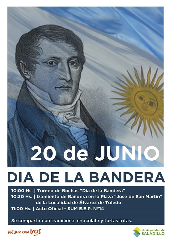 La municipalidad de Saladillo tiene el agrado de invitarlos al acto del día de la bandera que se desarrollara el 20 de junio en la localidad de Álvarez de Toledo.