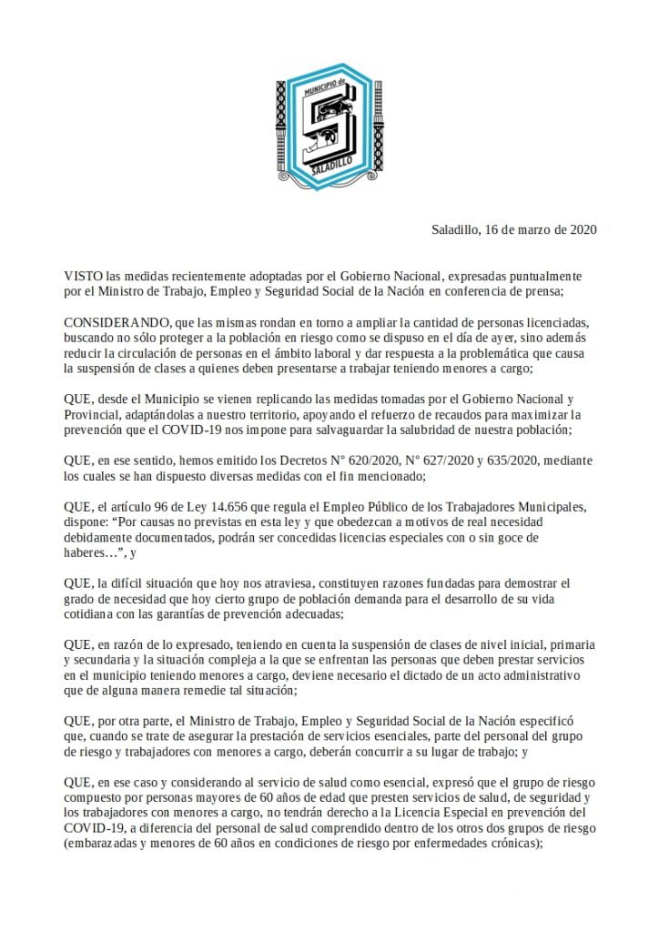 QUE, en razón de lo expresado, teniendo en cuenta la suspensión de clases de nivel inicial, primaria y secundaria y la situación compleja a la que se enfrentan las personas que deben prestar servicios en el municipio teniendo menores a cargo, deviene necesario el dictado de un acto administrativo que de alguna manera remedie tal situación;