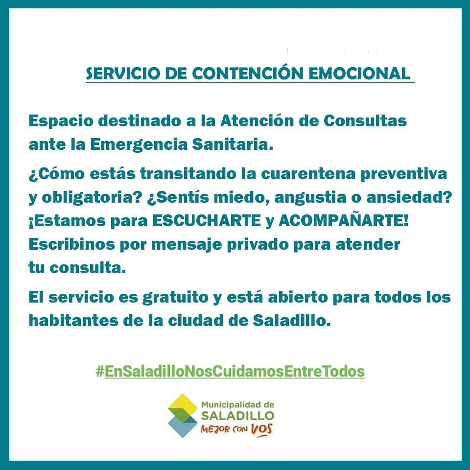 La Municipalidad de Saladillo informa que, ante el estado de Emergencia Sanitaria, se ha creado un Servicio de Contención Emocional destinado a atender las consultas vinculadas con la situación que le toca atravesar a la comunidad toda.