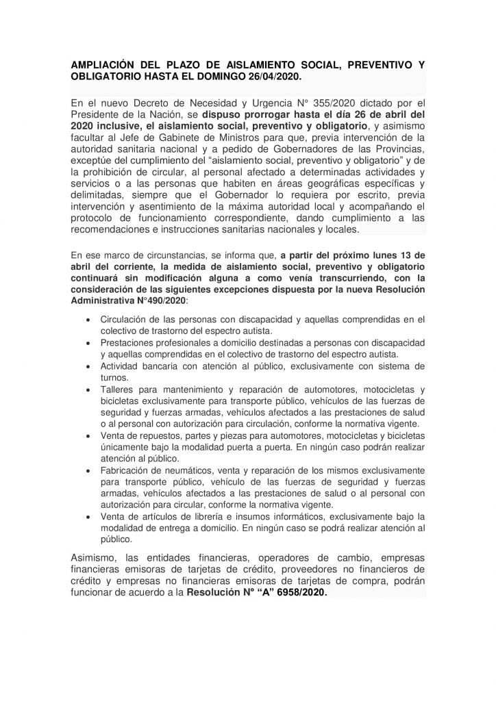 En ese marco de circunstancias, se informa que, a partir del próximo lunes 13 de abril del corriente, la medida de aislamiento social, preventivo y obligatorio continuará sin modificación alguna a como venía transcurriendo, con la consideración de las siguientes excepciones dispuesta por la nueva Resolución Administrativa N°490/2020: