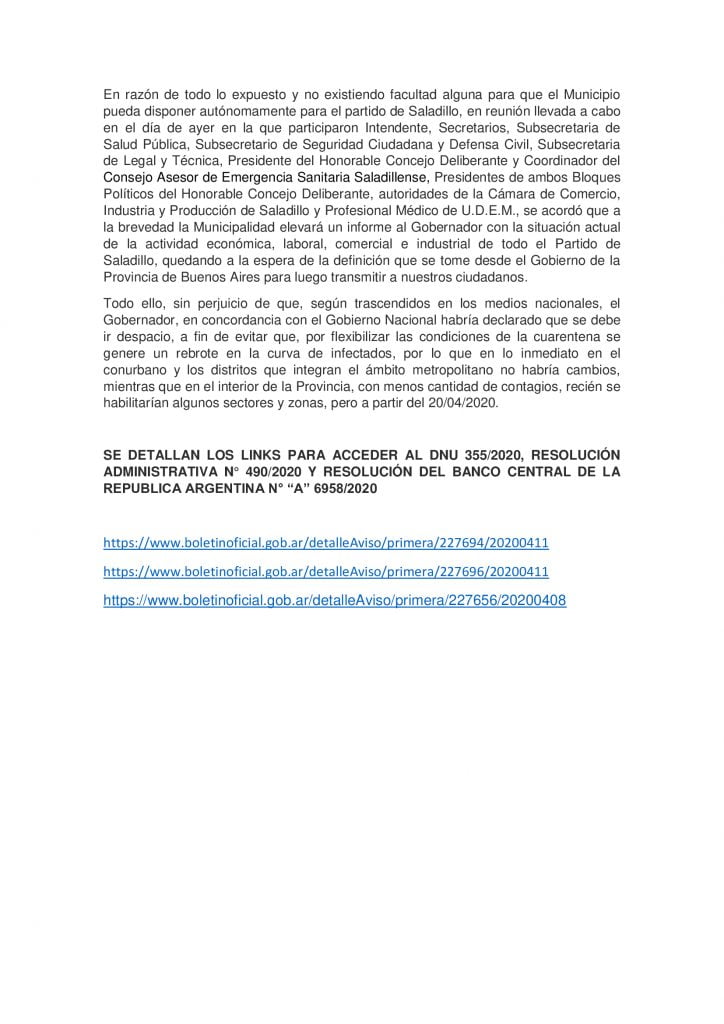En razón de todo lo expuesto y no existiendo facultad alguna para que el Municipio pueda disponer autónomamente para el partido de Saladillo, en reunión llevada a cabo en el día sábado en la que participaron Intendente, Secretarios, Subsecretaria de Salud Pública, Subsecretario de Seguridad Ciudadana y Defensa Civil, Subsecretaria de Legal y Técnica, Presidente del Honorable Concejo Deliberante y Coordinador del Consejo Asesor de Emergencia Sanitaria Saladillense, Presidentes de ambos Bloques Políticos del Honorable Concejo Deliberante, autoridades de la Cámara de Comercio, Industria y Producción de Saladillo y Profesional Médico de U.D.E.M., se acordó que a la brevedad la Municipalidad elevará un informe al Gobernador con la situación actual de la actividad económica, laboral, comercial e industrial de todo el Partido de Saladillo, quedando a la espera de la definición que se tome desde el Gobierno de la Provincia de Buenos Aires para luego transmitir a nuestros ciudadanos.