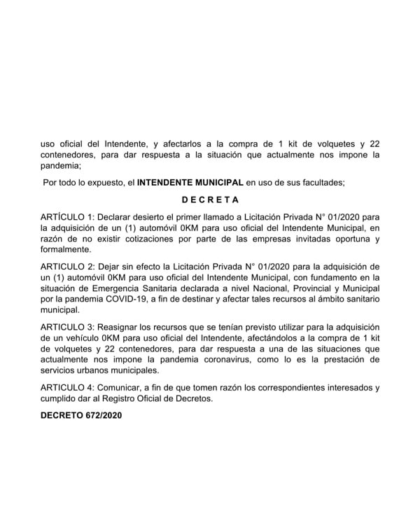 ARTICULO 3: Reasignar los recursos que se tenían previsto utilizar para la adquisición de un vehículo 0KM para uso oficial del Intendente, afectándolos a la compra de 1 kit de volquetes y 22 contenedores, para dar respuesta a una de las situaciones que actualmente nos impone la pandemia coronavirus, como lo es la prestación de servicios urbanos municipales.