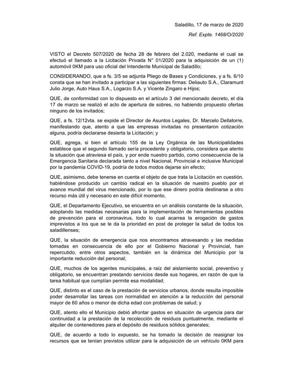 VISTO el Decreto 507/2020 de fecha 28 de febrero del 2.020, mediante el cual se efectuó el llamado a la Licitación Privada N° 01/2020 para la adquisición de un (1) automóvil 0KM para uso oficial del Intendente Municipal de Saladillo;