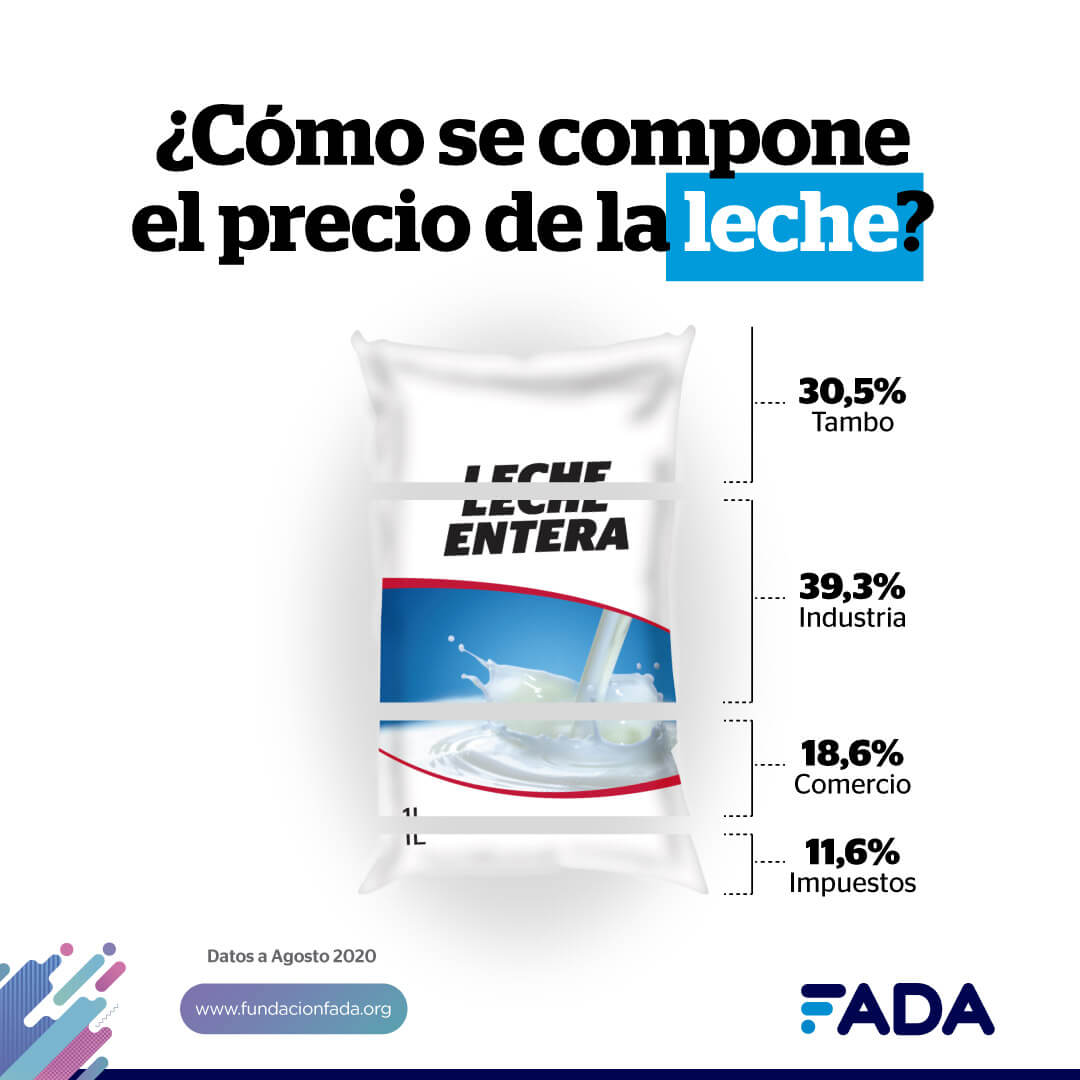 “La leche entera en sachet, tuvo un precio promedio de $60. De ese monto, el tambo representa el 30% ($18,33), la industria el 39% ($23,63), el comercio el 19% ($11,17) y los impuestos el 12% ($7)”, asegura FADA.