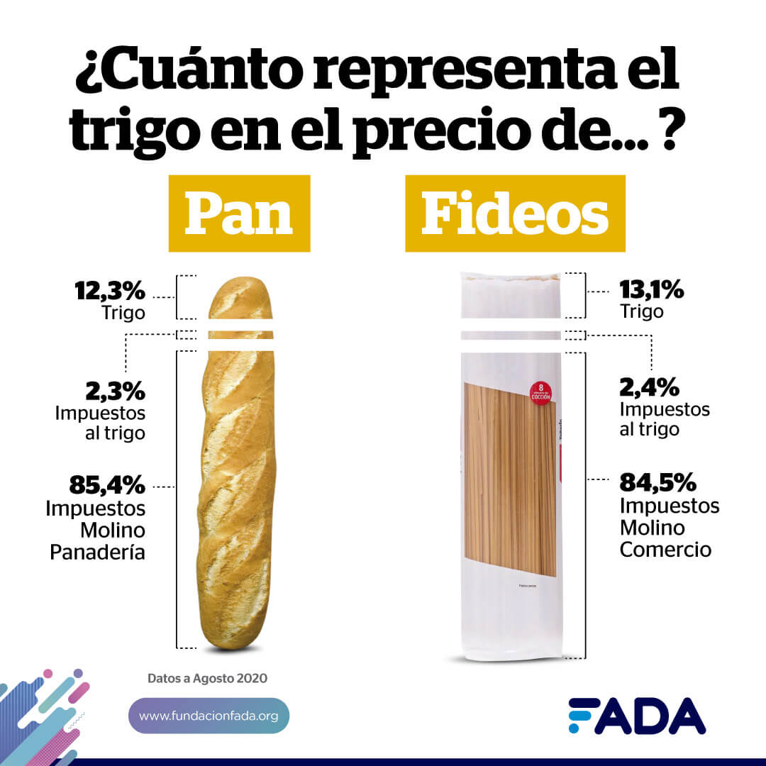 En el análisis sobre el pan francés, FADA registró que el consumidor paga un promedio de $107,50 por kilo. “En ese precio, el trigo representa el 12% ($13,27), el molino el 6% ($6,27), la panadería el 57% ($61,20) y los impuestos el 25% ($26,80)”, detalla el informe.