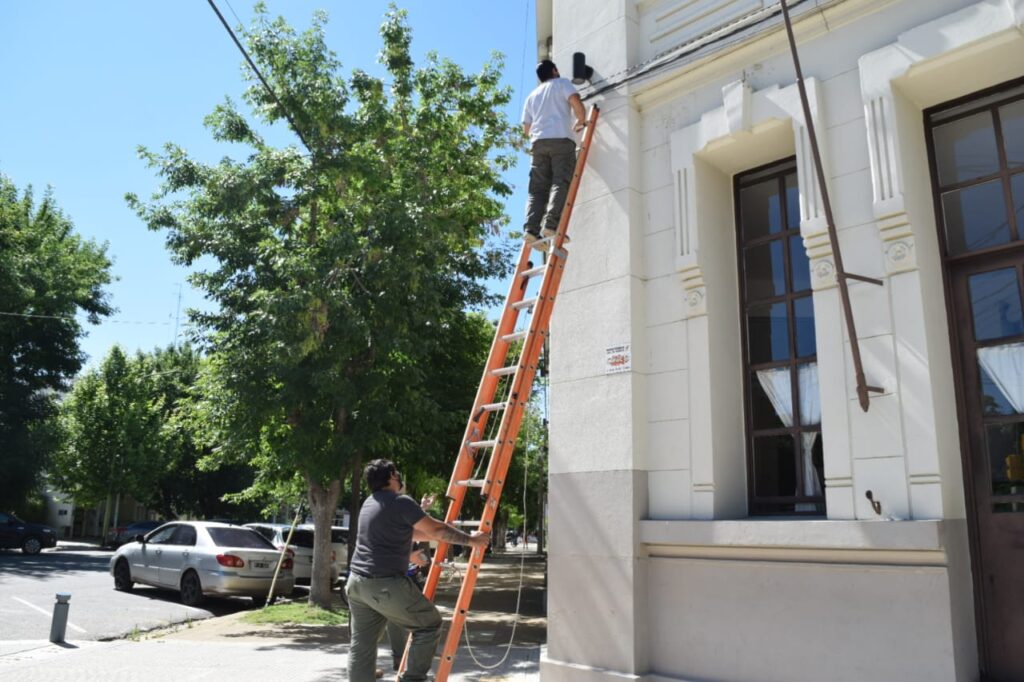 La cuadrilla de mantenimiento municipal estuvo realizando recambio de artefactos lumínicos en las fachadas del Palacio Municipal y de la Escuela Primaria N° 1.