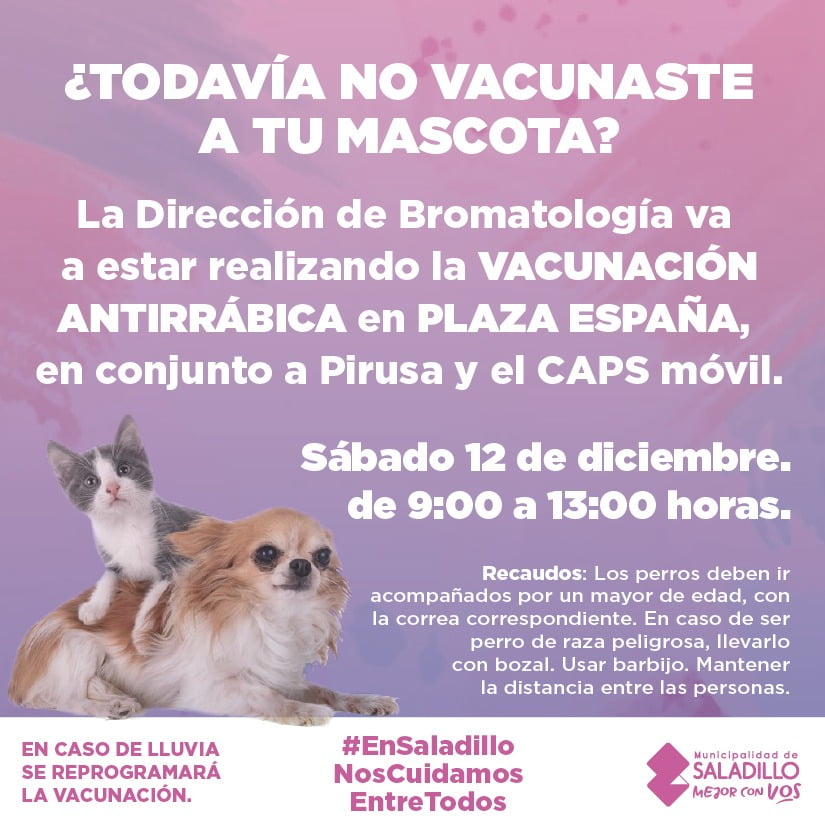 La Dirección de Bromatología va a estar realizando la vacunación antirrábica en Plaza España, en conjunto a Pirusa y el CAPS Móvil.
