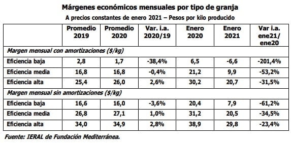 “Para una granja de eficiencia intermedia según los parámetros definidos (2,8 kilos de conversión y 3.536 kilos de capón / año), el ajuste de márgenes es del 53 por ciento. De un excedente de 21,2 pesos por kilo se baja a uno de 9,9 pesos”, resume el informe.