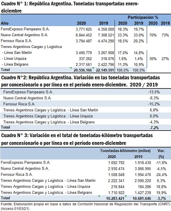 El cálculo es en base a las cuatro empresas que operan los servicios de carga por tren en Argentina: las privadas FerroExpreso Pampeano, Nuevo Central Argentino (NCA) y Ferrosur Roca; y la estatal Trenes Argentinos Cargas y Logística, que administra las líneas Belgrano, Santa Martín y Urquiza.