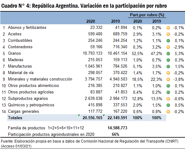 Otro aspecto importante es que se elevó la participación del agro sobre el total transportado, del 61 por ciento de 2019 al 66 por ciento.