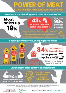 Casi todos los hogares estadounidenses (98,4 por ciento) compraron carne en 2020 (IRI), y el 43 por ciento de los estadounidenses ahora compran más carne que antes de la pandemia, principalmente porque están preparando más comidas en casa.