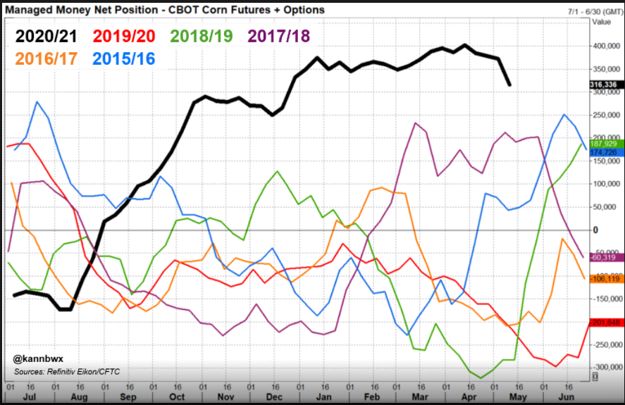 Las fuentes comerciales vinculan a los fondos de materias primas como vendedores de 122.000 futuros de maíz durante las últimas tres sesiones. Dentro de una semana de informes de la CFTC, la mayor venta neta de los administradores de dinero fue de 114,372 contratos de futuros de maíz (sin incluir opciones) en marzo de 2017.