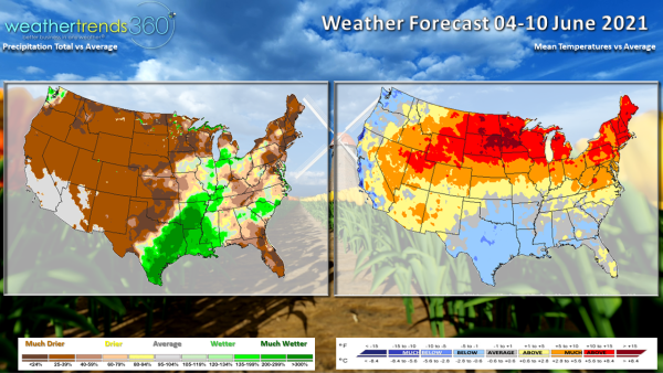 Según los datos de WeatherTrends360 , la semana que finaliza el 10 de junio de 2021 será una de las más calurosas y secas en más de 30 años para el Corn Belt. Los suelos secos en el oeste y partes del cinturón de maíz central ayudarán a calentar la región más rápidamente: esto actúa como un circuito de retroalimentación con suelos secos que intensifican el calor y calientan aún más los suelos secando. Aunque el calor en esta etapa de la temporada no debería tener un gran impacto en los rendimientos totales, existe el riesgo de que el ciclo cálido y seco continúe a medida que ingresemos a etapas más frágiles del desarrollo del maíz, como la polinización, más profundamente en el verano.