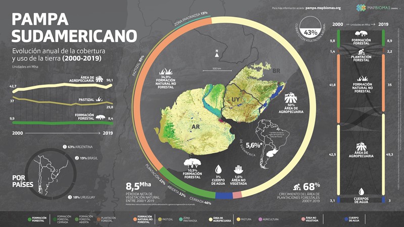 MapBiomas Pampa Sudamericano es una iniciativa que constituye una red colaborativa de especialistas de la Argentina (INTA, Universidad Nacional de San Luis y la ONG Fundación Vida Silvestre), Brasil (Universidade Federal do Rio Grande do Sul y GeoKarten) y Uruguay (Facultad de Agronomía y Facultad de Ciencias de la Universidad de la República, Instituto Nacional de Investigación Agropecuaria-INIA y el Ministerio de Ambiente). Con una resolución de 30 metros y 8 clases de leyendas, se presentó la primera versión de los mapas de uso y cobertura del suelo. La Colección 1 de MapBiomas Pampa Sudamericano (2000-2019) abarca una superficie de 1.005.780 km², que representa un 5,6 % del área de América del Sur.