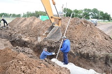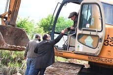 El Intendente Municipal Ing. José Luis Salomón acompañado por el Secretario de Desarrollo Local Vladimir Wuiovich, concurrió a observar la obra de colocación de tubos de hormigón en el cruce de la calle Roigt que conectará el canal que se construyó paralelo al predio de la futura playa de camiones con el desagüe existente.
