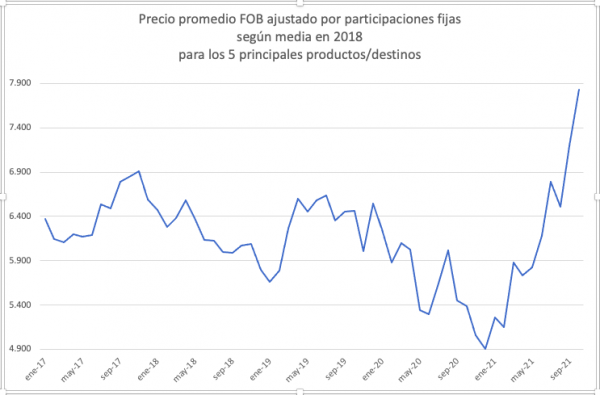 Al calcular el precio ponderado según una canasta fija de destinos, tomando a los principales grupos de producto/mercado, el valor del mes pasado es el más alto desde enero de 2017, como se ve en el gráfico.