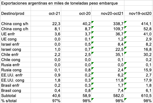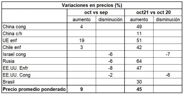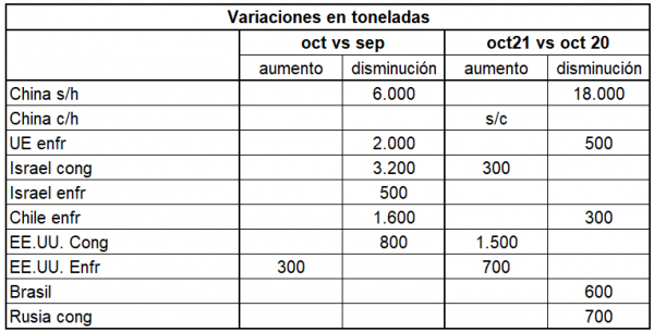 Comparados con septiembre pasado, casi todos los destinos disminuyen, con una mínima excepción de enfriado a EE.UU. Lo mismo sucede comparado con un año atrás, cuando sólo EE.UU. e Israel van en dirección contraria.