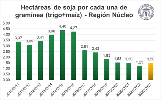 7 años atrás, la región núcleo sembraba 4,4 hectáreas de soja por cada una de trigo o maíz. Luego las gramíneas subieron y en el 2021 la relación bajó a 1,23. La tendencia era alcanzar el 1 a 1 en el 2022, pero la soja sumaría 400.000 ha y el índice sube a 1,5.