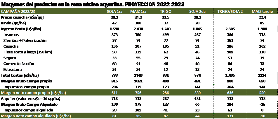 Todos se preguntan si con estas condiciones es un año para volver apostar por las gramíneas, o sea invertir en fertilizantes y en híbridos. En campo propio hacer soja requiere una inversión de 783 u$s/ha; hacer maíz, 1.349 u$s/ha. Para campo alquilado, la condición que representa al 70% del área cultivada en la región, al tener en cuenta el costo alquiler, el cálculo de los retornos de inversión de cada cultivo son: 5% para soja de primera, 12% para maíz temprano y 6% para la rotación trigo-soja 2°. ¿Qué quiere decir esto? Que por cada dólar invertido por hectárea el productor de soja gana 0,05 u$s además de haber recuperado todos los costos en los que ha incurrido. Mientras que en maíz temprano y trigo/soja 2° gana aproximadamente 12 y 6 centavos de dólar respectivamente por cada dólar invertido al inicio del ciclo.
