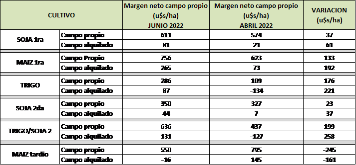 Hay cambios y son muchos. El primero es que para trigo la proyección de rinde para los cálculos se ha ajustado a la baja en función de los pronósticos climáticos y el uso potencial de tecnología. El trigo pasa a considerarse con 37 qq/ha vs los 40 que se proyectaban en abril. (aclaración: para la comparación se ha vuelto a calcular los márgenes trigueros de abril con 37 qq/ha, valor que está por debajo del punto de indiferencia, lo que explica por qué es negativo el valor que aparece para campo alquilado). El costo medio de los alquileres en región núcleo ha aumentado de 16 qq/ha a 18 qq/ha. El precio de los fertilizantes ha descendido, en particular la urea que pasó de 1.442 u$s/tn a 1.060 u$s/tn. Y el precio a cosecha de los commodities también varió: el maíz descendió un 10%, el trigo se mantuvo y la soja aumento un 3%. Estas alteraciones en las variables han impactado en el cálculo de los márgenes y en consecuencia en su comparación con los del mes de abril. Lo que se observa es una mejora de los márgenes netos (en términos absolutos) de todos los cultivos. La rotación trigo/soja 2° en campo alquilado es el que ha presentado la mayor variación positiva (+258 u$s/ha), mientras que la soja de 2° en campo propio es la que ha experimentado la menor mejora en los márgenes con 23 u$s más por hectárea.