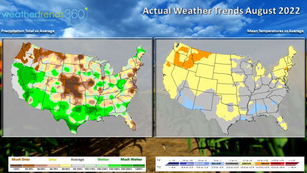 Este patrón de precipitaciones irregulares en Corn Belt, pero un clima más húmedo en el sur, continuará durante la primera semana completa de septiembre, hasta el 10 de septiembre. Según los pronósticos de WeatherTrends360, esta será la octava más cálida y una de las más secas. primeras semanas completas de agosto en más de 30 años para el Corn Belt. El clima cálido y seco secará los suelos y estresará la vegetación, pero un clima más seco favorecerá las actividades de cosecha en los campos donde los cultivos están listos.