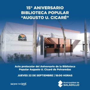 La Biblioteca Popular “Augusto U. Cicaré” de Polvaredas invita a la comunidad al acto protocolar en su 15° aniversario que se realizará el jueves 22 de septiembre a las 18 Hs. Desde la Subsecretaría de Cultura, Educación y Derechos Humanos de la Municipalidad de Saladillo, entendemos que los espacios como las bibliotecas, tienen un rol fundamental en las comunidades porque garantizan libertades y derechos humanos tan básicos como la educación, la información, la libre expresión, la identidad y el acceso a la cultura.