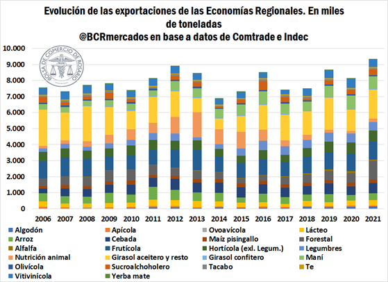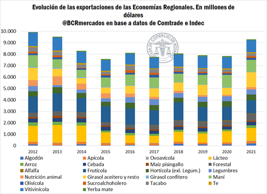 Respecto a los números de ventas externas de la última década, éstos muestran la tendencia de avance que se viene manifestando en las economías regionales y la participación que tiene cada uno de estos sectores en el total exportado. Tomando en cuenta las estimaciones de Comtrade y de INDEC, en el siguiente cuadro se estiman las exportaciones de las economías regionales y la participación de cada cadena de valor en los últimos quince años, observando que, en 2021, las economías regionales fueron responsables de 9.280 millones de dólares, acercándose al máximo de 2012 donde se contabilizaron US$ 9.937 millones.