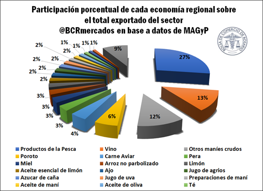 El conjunto de productos de la pesca, si bien tuvo un crecimiento levemente negativo si lo comparamos con el período enero-julio de 2021, a nivel de participación porcentual sobre el total representó casi un tercio de las ventas externas de las economías regionales este año. Le sigue el vino, y los maníes crudos, el poroto, la carne aviar y la pera.