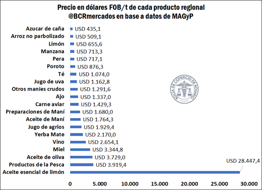 Finalmente, se exponen los valores de exportación de los distintos productos regionales, observando que los productos de la pesca, el aceite esencial de limón y el aceite de oliva resultan los más altos en términos de dólares por tonelada.