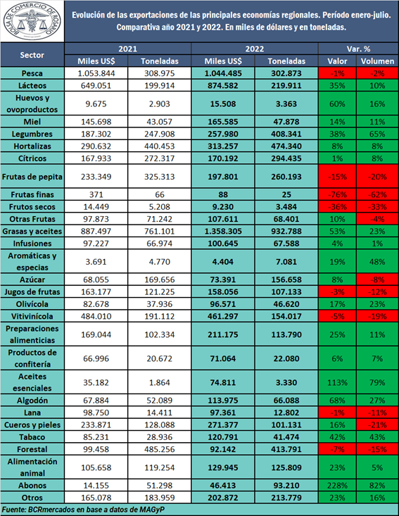 En el siguiente cuadro se muestran los valores de exportación para los siete primeros meses del año actual, comparado con lo sucedido a igual período del año 2021, por sector.
