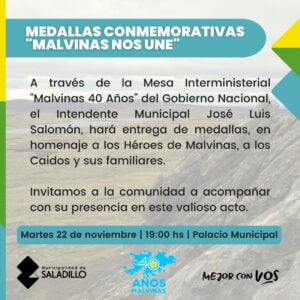 A través de la Mesa Interministerial «Malvinas 40 Años» del Gobierno Nacional, el Intendente Municipal Ing. José Luis Salomón, hará entrega de medallas, en homenaje a los Héroes de Malvinas, a los Caídos y sus familiares.