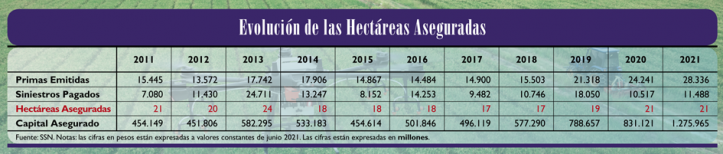 En efecto, según datos de la citada encuesta que año a año realiza la SSN, desde el año 2011 hasta 2021, la cantidad de hectáreas aseguradas osciló entre 17 y 21 millones. En 2020 y 2021, se mantuvo sin alteraciones en 21 millones de hectáreas.