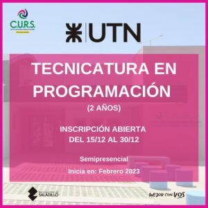 El Centro Universitario Regional de Saladillo informa que se encuentra abierta la inscripción, hasta el 30 de diciembre, a la carrera Tecnicatura en Programación de la Universidad Tecnológica Nacional. La misma se dictará mediante el convenio del Programa “Puentes” a partir del 2023, con una duración de 2 años y modalidad semipresencial.