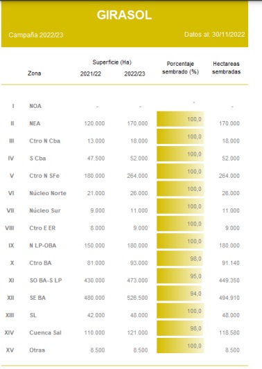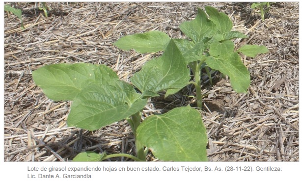 Sobre las zonas Centro-Norte de Santa Fe y Centro-Este de Entre Ríos se registran los primeros cuadros transitando etapas reproductivas. Hacia las zonas Oeste de Buenos Aires-Norte de La Pampa, Centro de Buenos Aires y la Cuenca del Salado, gran parte de los cuadros de girasol expande hojas bajos buenas condiciones sanitarias, pero aún con reservas hídricas ajustadas. En el sur del área agrícola, se espera culminar con la siembra durante el mes de diciembre.