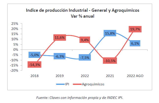 El año 2022, es de crecimiento mutuo. Tanto el sector industrial general, como el de producción de agroquímicos nacional crecen respecto al 2021. El sector de agroquímicos pega un salto, creciendo un 19,7% hasta agosto del 2022, luego de la caída del año anterior. Los mejores precios internacionales son un incentivo que generó mayor demanda.