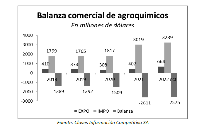 La industria de agroquímicos es estructuralmente deficitaria, ya que no solo los productos, sino también los insumos que se utilizan para la producción local son de origen importado. El déficit de la balanza comercial fue de casi USD 2611 millones en 2021. Si bien en el peso total es pequeño, se observa un gran aumento en las exportaciones de fertilizantes a los países vecinos como Uruguay, Paraguay y chile. En los primeros 10 meses del 2022 llegaron a los 377 millones de dólares.