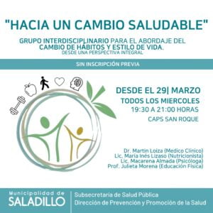La Dirección de Prevención y Promoción de la Salud, invita a toda la comunidad a participar del “Grupo Interdisciplinario para el abordaje del cambio de hábitos y estilo de vida, desde una perspectiva integral” que tendrá lugar a partir del 29 de marzo, todos los miércoles de 19:30 a 21:00 horas en el CAPS San Roque.