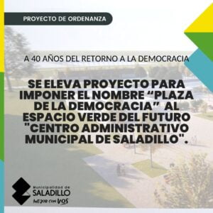 En este sentido, se elevó al Honorable Concejo Deliberante un proyecto de Ordenanza para imponer el nombre “Plaza de la Democracia” al espacio verde del Futuro «Centro Administrativo Municipal de Saladillo», ubicado en Frocham y Bozán.