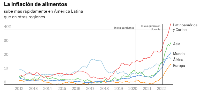 Si bien la inflación, tanto general como la de alimentos en particular, ha aumentado en todo el mundo, la magnitud del incremento en Latinoamérica y el Caribe es mucho mayor que en otras regiones, según datos de la Organización de las Naciones Unidas para la Alimentación y la Agricultura (FAO). La tasa de inflación de los alimentos promedio para la región alcanzó 43,9% en septiembre de 2022, muy por encima, por ejemplo, del 30% registrado en Asia, región con la segunda inflación alimentaria más alta en el mundo.