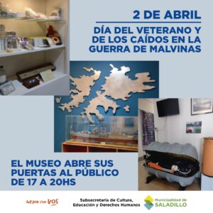 El Museo abre sus puertas al público el domingo 2 de abril de 17 a 20 horas para recorrer la sala Malvinas Argentinas, este espacio de homenaje en la muestra permanente en el Museo de Saladillo busca mantener viva la memoria colectiva y el reconocimiento a nuestros heroes.
