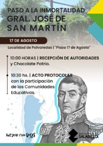 El acto Protocolar, tendrá lugar el jueves 17 de agosto a partir de las 10:00 hs. en la Localidad de Polvaredas, en la Plaza que lleva el nombre de este día tan relevante para nuestra Patria.