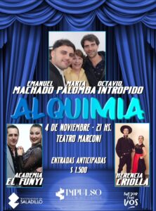 El 4 de noviembre a las 21 horas en el Teatro Marconi en el marco del programa Impulso, ciclo de arte itinerante se presentará el espectáculo Alquimia, con la actuación de Marta Palomba, Emanuel Machado y Octavio Intrópido, la Academia de Tango El Funyi y Herencia Criolla.