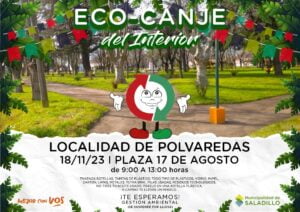 Publicado el 17/11/202316/11/2023 por saladillocampoECO-CANJE DEL INTERIOR Día: sábado 18 de noviembre Lugar: localidad de Polvaredas (Plaza 17 de Agosto) Hora: 9:00 a 13:00 horas. ¡TE ESPERAMOS! (Se suspende por lluvia)