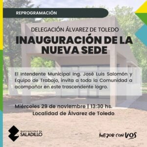 El Intendente José Luis Salomón y equipo de trabajo, invitan a toda la comunidad a participar del acto de inauguración de la nueva sede de la Delegación de Álvarez de Toledo, obra desarrollada en su totalidad con fondos municipales.
