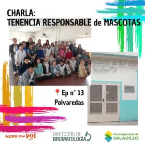 La Dirección de Bromatología informa que semanas atrás se continuó con la charla de tenencia responsable de mascotas y adopción en los diferentes establecimientos educativos de la ciudad con el objetivo de brindarles información a los alumnos y de esta forma concientizar así a toda la comunidad.