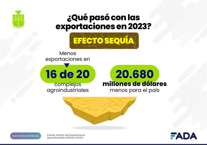 «No fue un buen año para las exportaciones agroindustriales: de los 20 complejos que analizamos, en 16 cayeron las exportaciones, lo que ocasionó que ingresen 20.680 millones de dólares menos al comparar con lo exportado en 2022. Esto fue producto de la sequía y de los precios internacionales», observa Pisani Claro.